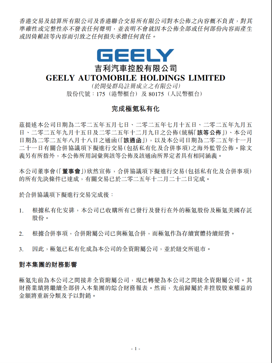 12月22日,吉利汽车控股有限公司(0175.HK)(简称“吉利汽车”)发布公告,宣布已正式完成极氪智能科技控股有限公司(简称“极氪”)私有化及合并事项的交易,极氪已成为吉利汽车的全资附属公司,并从即日起于纽交所退市。