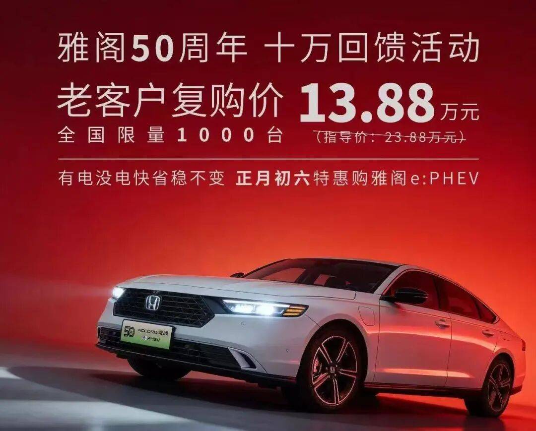 2026年2月22日,春节假期临近尾声,广汽本田宣布一项优惠政策:在雅阁50周年之际,推出雅阁e:PHEV老客户复购价13.88万元,限量1000辆。