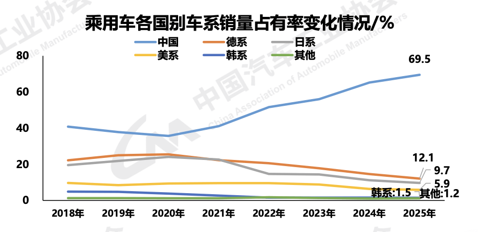 根据中国汽车工业协会的数据,2025年,中国品牌乘用车销量占有率为69.5%,外资、合资为30%左右,其中,日系占有率排在德系之后,为9.7%。
